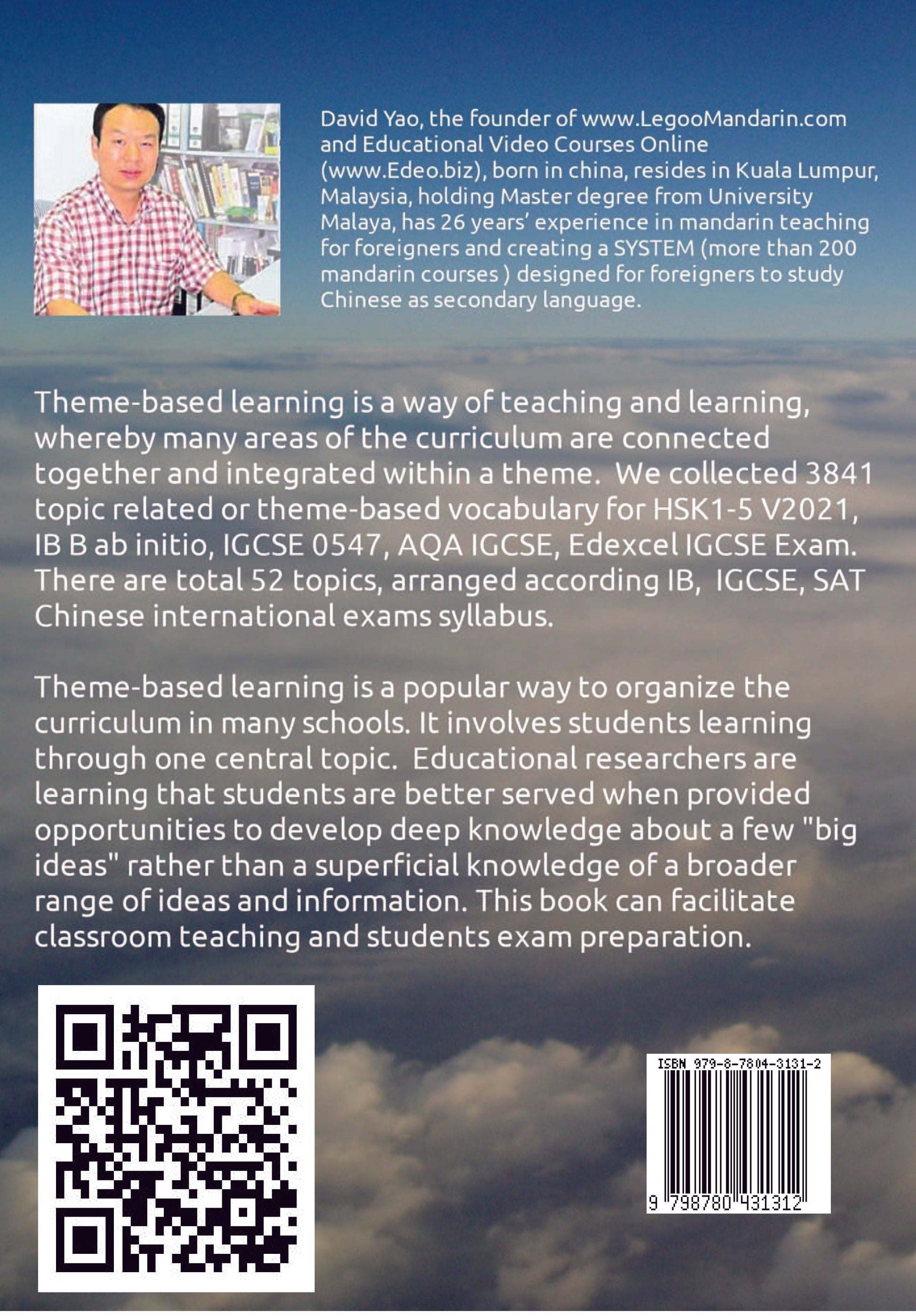 Theme-based learning is a way of teaching and learning, whereby many areas of the curriculum are connected together and integrated within a theme. We collected 3841 topic related or theme-based vocabulary for HSK1-5 V2021, IB B ab initio, IGCSE 0547, AQA IGCSE, Edexcel IGCSE Exam. There are total 52 topics, arranged according IB, IGCSE, SAT Chinese international exams syllabus.