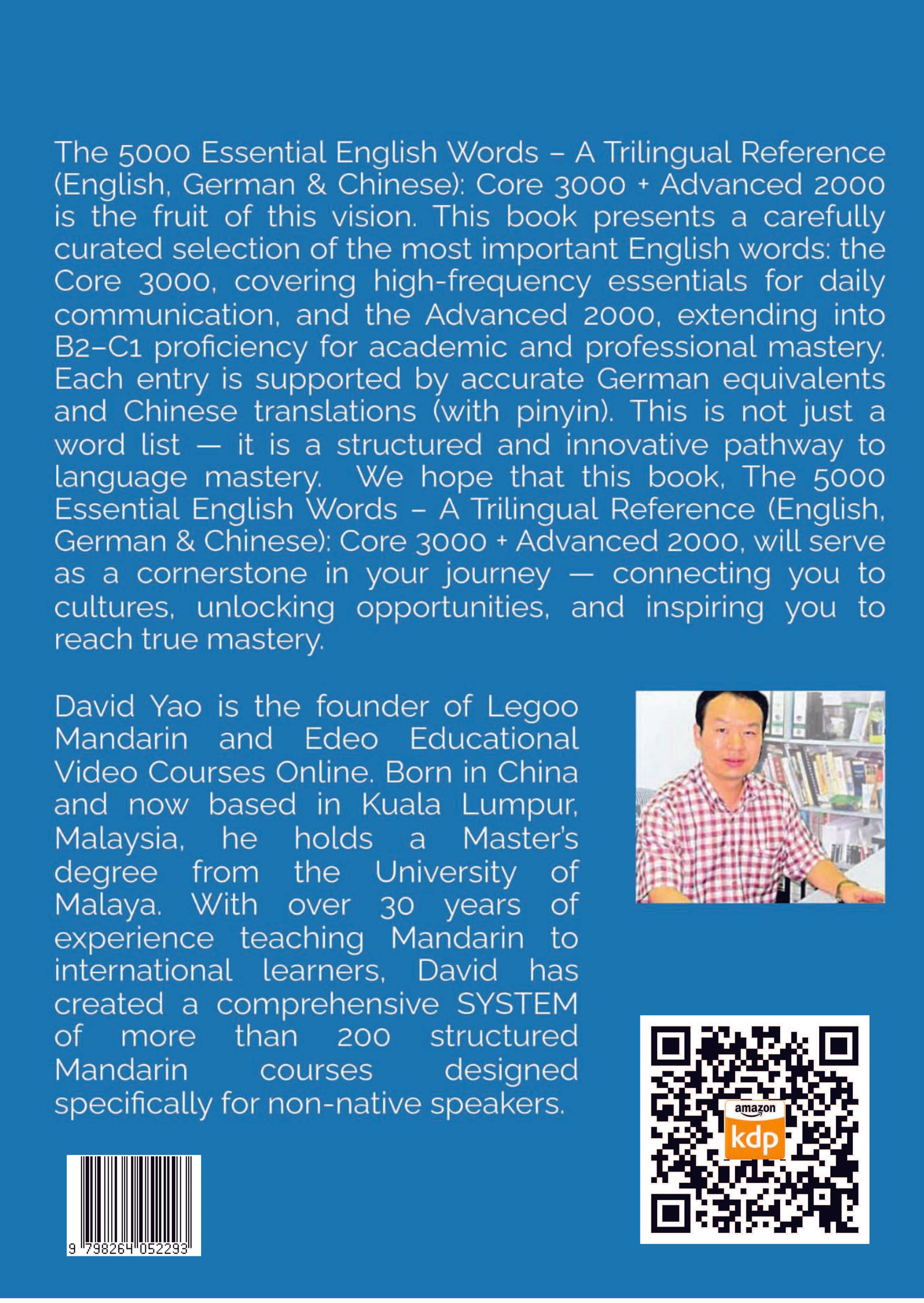 The 5000 Essential English Words – A Trilingual Reference (English, German & Chinese): Core 3000 + Advanced 2000 is the fruit of this vision. This book presents a carefully curated selection of the most important English words: the Core 3000, covering high-frequency essentials for daily communication, and the Advanced 2000, extending into B2–C1 proficiency for academic and professional mastery. Each entry is supported by accurate German equivalents and Chinese translations (with pinyin). This is not just a word list — it is a structured and innovative pathway to language mastery.