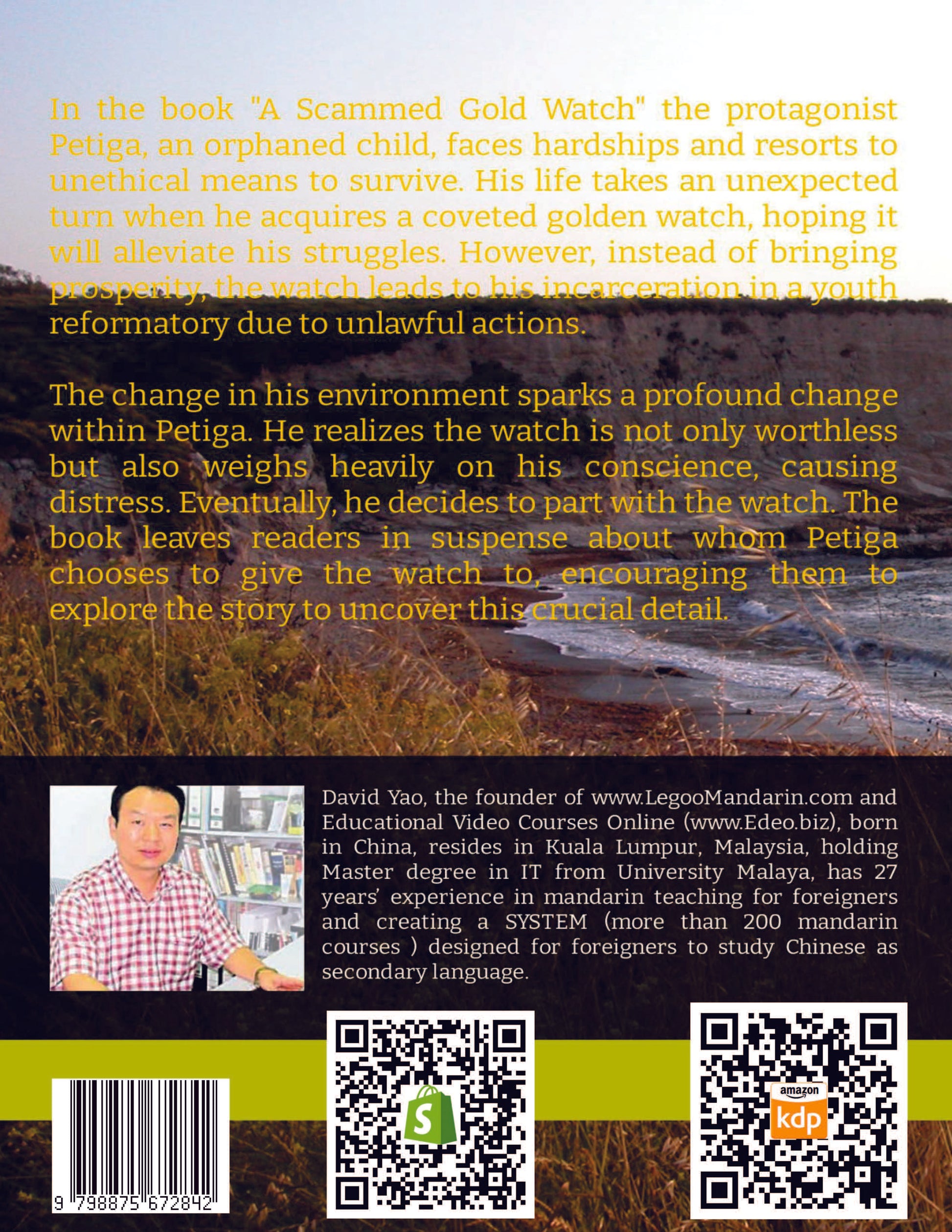 In the book "A Scammed Gold Watch 骗来的金表" the protagonist Petiga, an orphaned child, faces hardships and resorts to unethical means to survive. His life takes an unexpected turn when he acquires a coveted golden watch, hoping it will alleviate his struggles. However, instead of bringing prosperity, the watch leads to his incarceration in a youth reformatory due to unlawful actions.