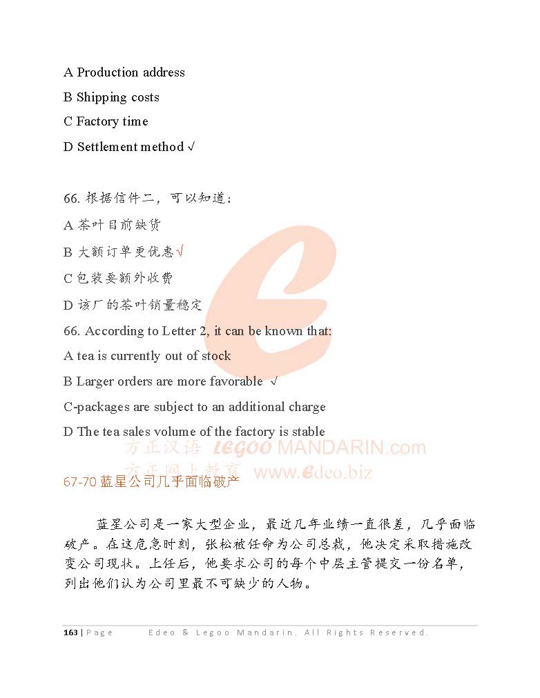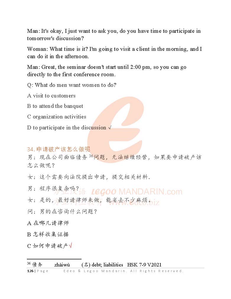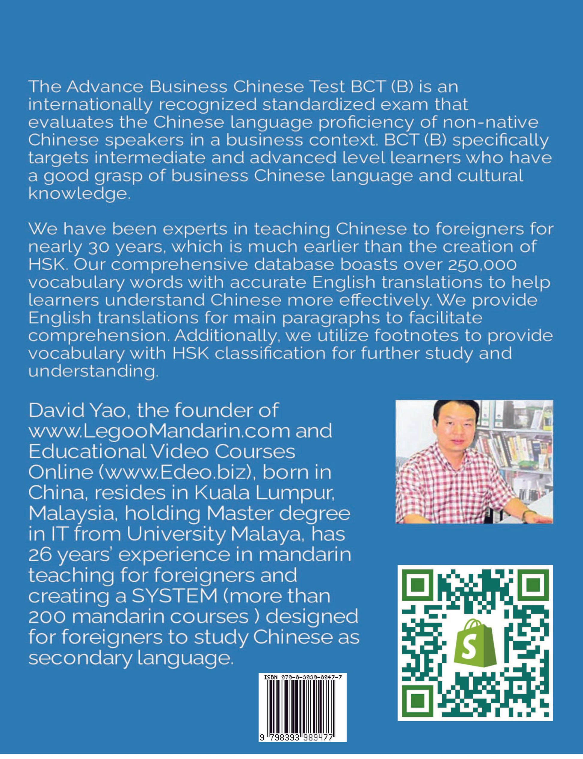 The Advance Business Chinese Test BCT (B) is an internationally recognized standardized exam that evaluates the Chinese language proficiency of non-native Chinese speakers in a business context. BCT (B) specifically targets intermediate and advanced level learners who have a good grasp of business Chinese language and cultural knowledge. It assesses the learners' ability to communicate effectively in Chinese in different business settings, including negotiating, discussing business plans, making presentations, and socializing with business partners. The BCT (B) exam is administered by the Confucius Institute Headquarters (Hanban) and is recognized by many educational institutions and corporations around the world.