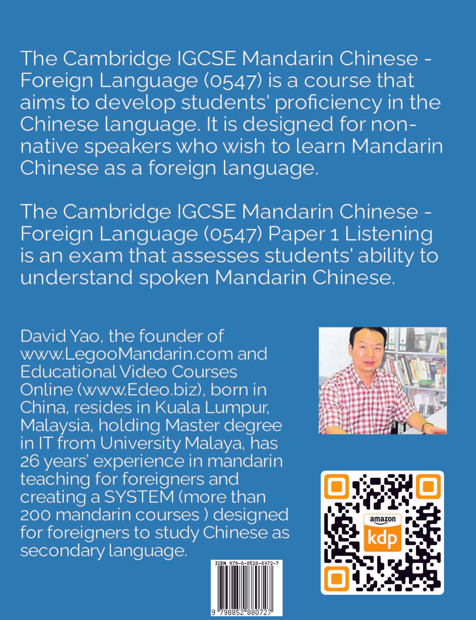 The Cambridge IGCSE Mandarin Chinese - Foreign Language (0547) Paper 1 Listening is an exam that assesses students' ability to understand spoken Mandarin Chinese.