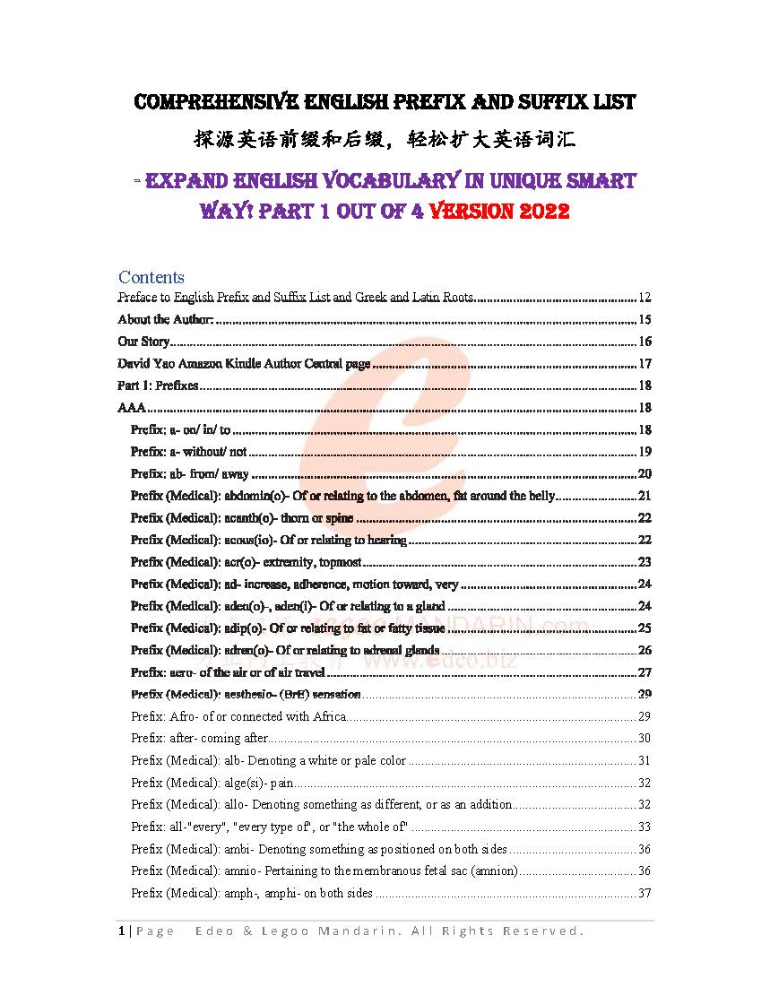 Comprehensive English Prefix and Suffix List 探源英语前缀和后缀,轻松扩大英语词汇 - Expand English Vocabulary in Unique Smart Way! Part 1 out of 4 Version 2022