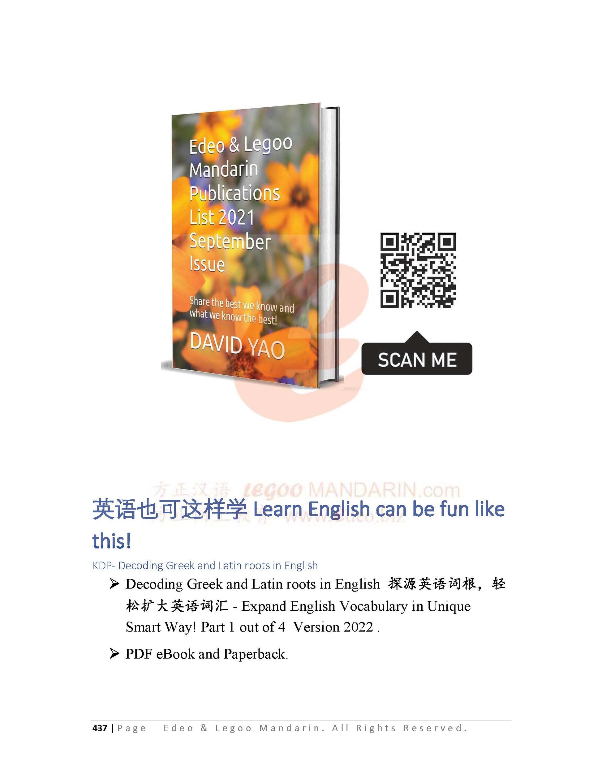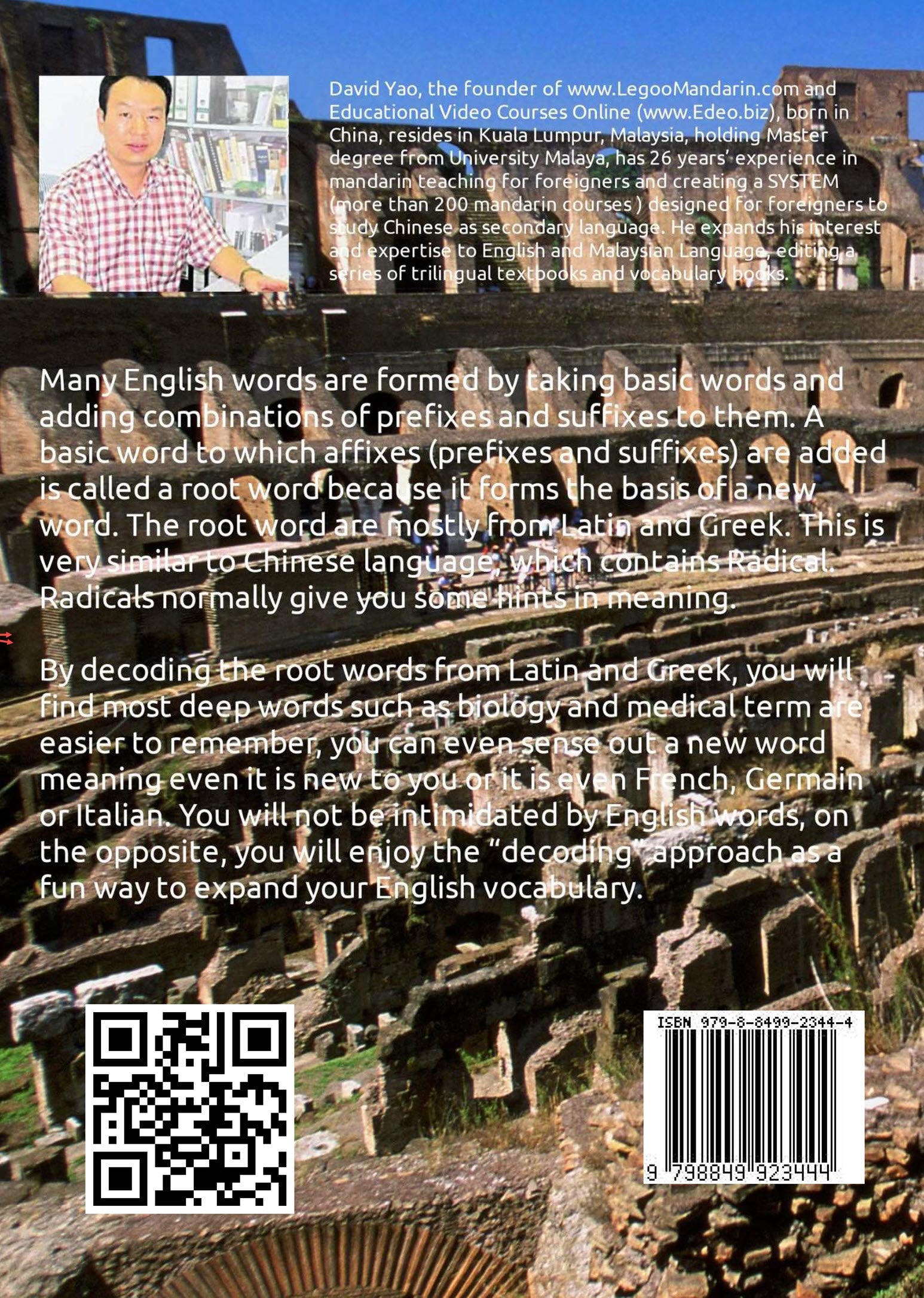 By decoding the root words from Latin and Greek, you will find most deep words such as biology and medical term are easier to remember, you can even sense out a new word meaning even it is new to you or it is even French, Germain or Italian. You will not be intimidated by English words, on the opposite, you will enjoy the “decoding” approach as a fun way to expand your English vocabulary.