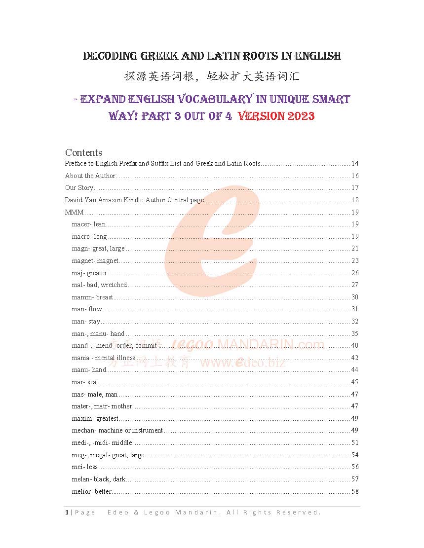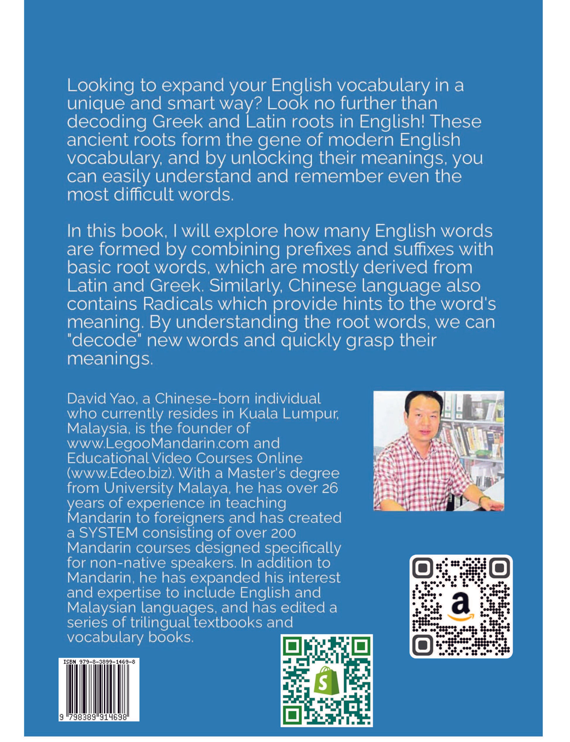 In this book, I will explore how many English words are formed by combining prefixes and suffixes with basic root words, which are mostly derived from Latin and Greek. Similarly, Chinese language also contains Radicals which provide hints to the word's meaning. By understanding the root words, we can "decode" new words and quickly grasp their meanings.