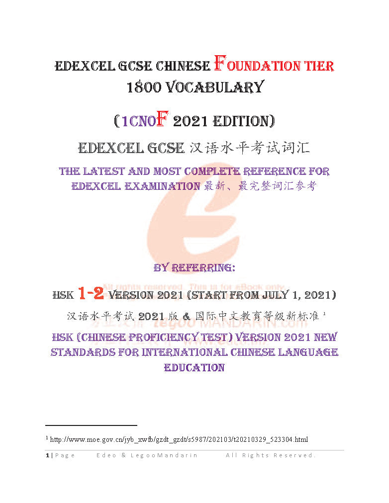 Edexcel GCSE Chinese Foundation Tier 1800 Vocabulary (1CN0F 2021 Edition)