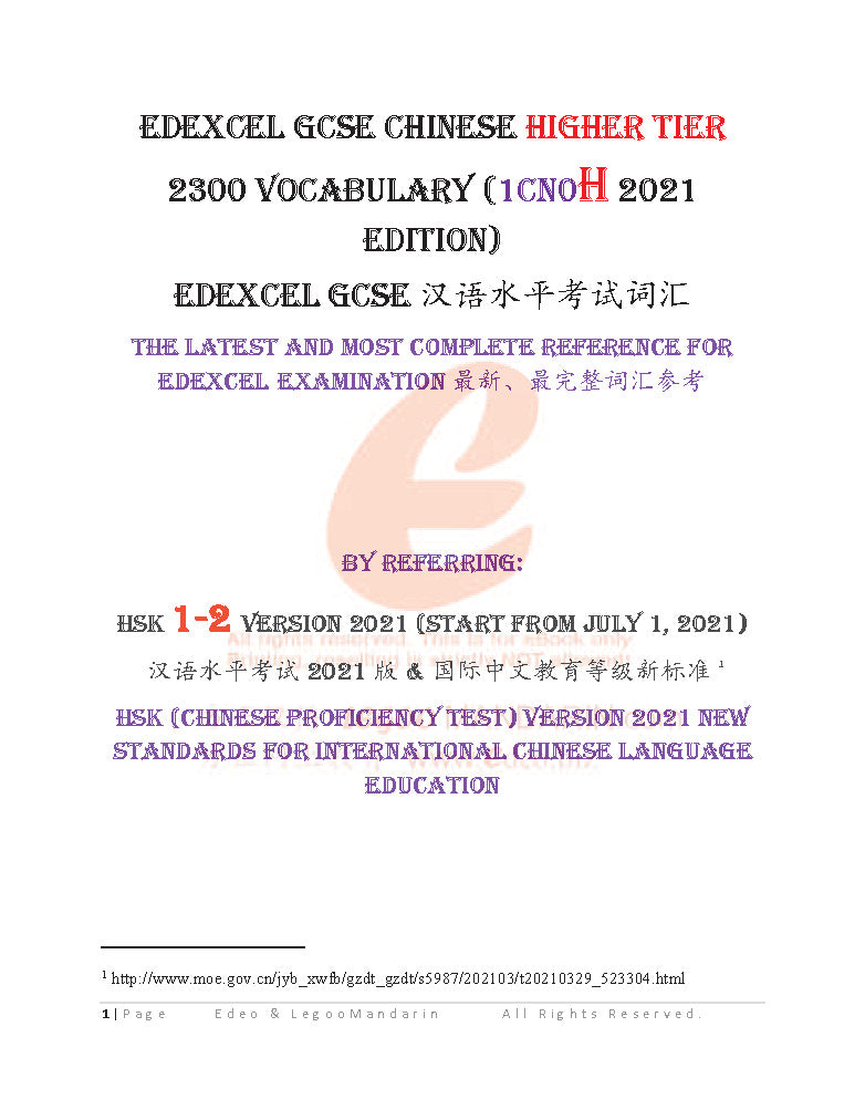 Edexcel GCSE Chinese Higher Tier 2300 Vocabulary (1CN0H 2021 Edition) Edexcel GCSE 汉语水平考试词汇-The latest and most complete reference by referring HSK 1-2 Version 2021 最新、最完整词汇参考