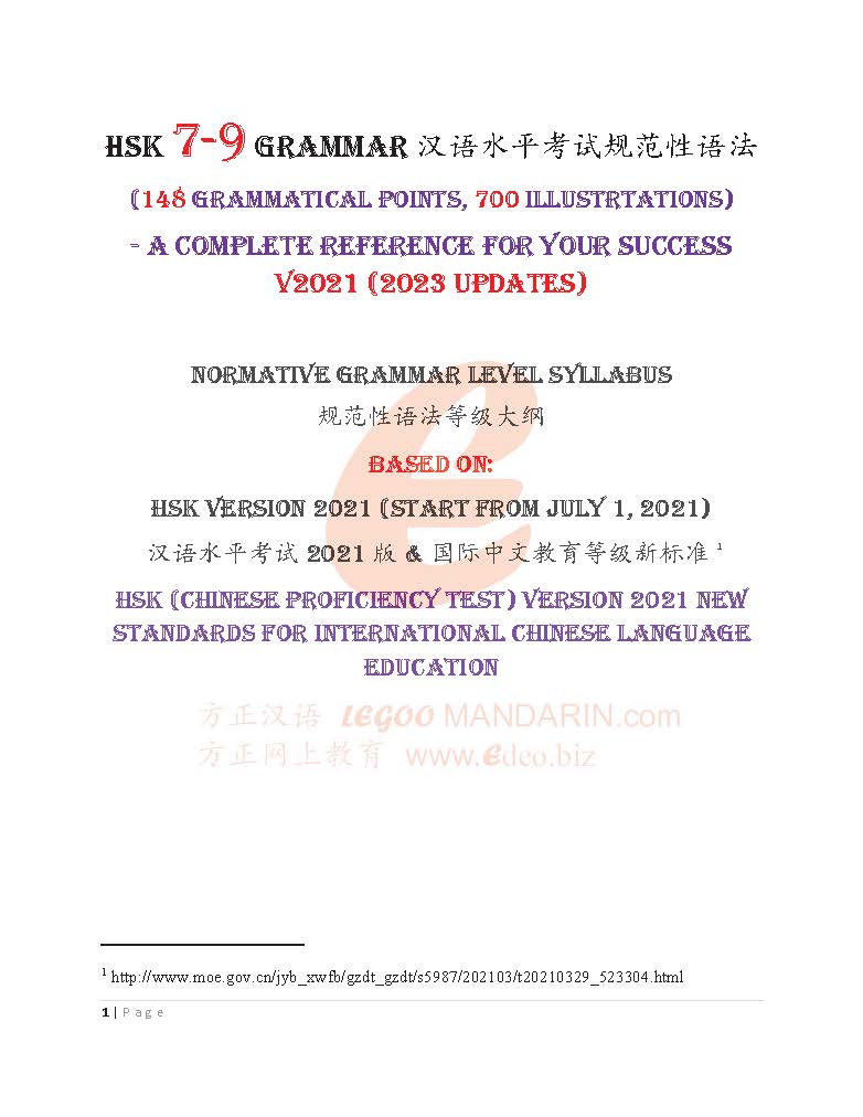 In HSK (Level 7-9) Version 2021 Grammar, we cover 148 grammatical points, use 700 sentences to explain the detail usage. This Normative Grammar Level syllabus is based on New Standards for International Chinese Language Education, which started from July 1, 2021.