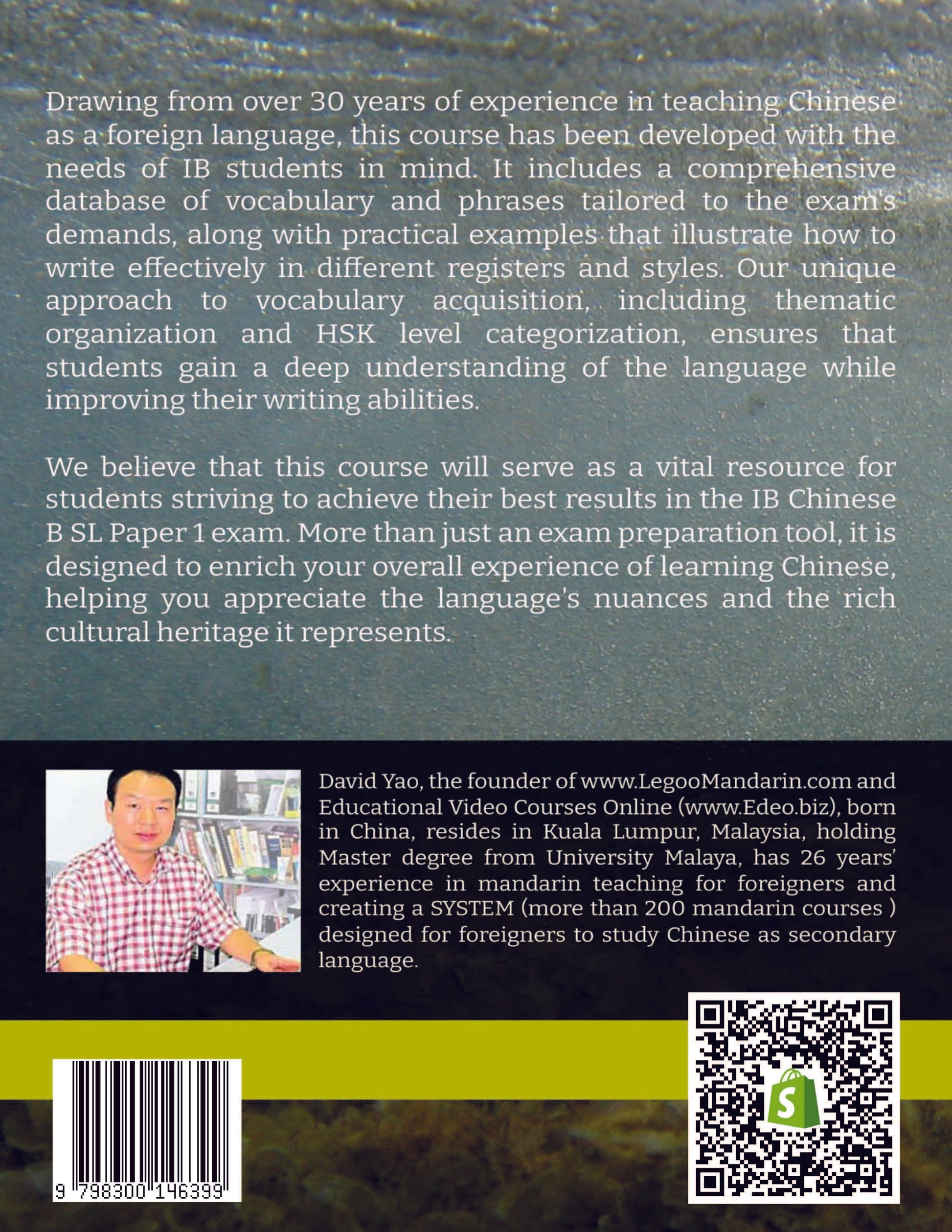 Drawing from over 30 years of experience in teaching Chinese as a foreign language, this course has been developed with the needs of IB students in mind. It includes a comprehensive database of vocabulary and phrases tailored to the exam's demands, along with practical examples that illustrate how to write effectively in different registers and styles. Our unique approach to vocabulary acquisition, including thematic organization and HSK level categorization, ensures that students gain a deep understanding of the language while improving their writing abilities.