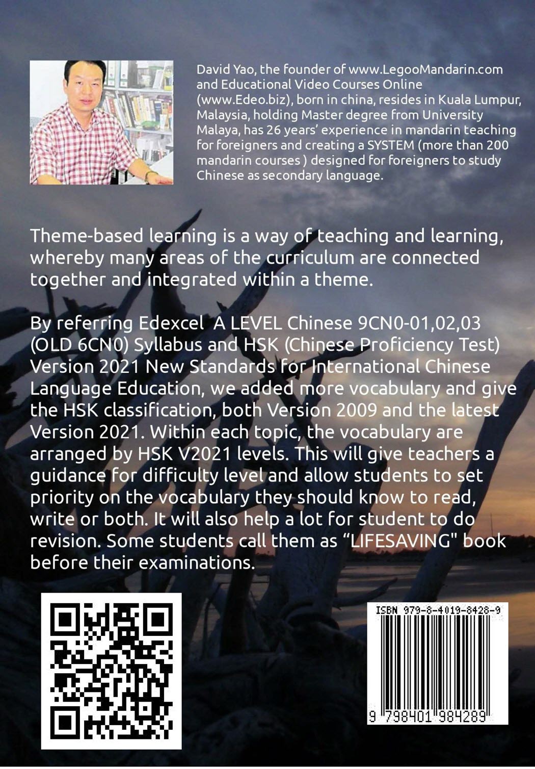 By referring Edexcel A LEVEL Chinese 9CN0-01,02,03 (OLD 6CN0) Syllabus and HSK (Chinese Proficiency Test) Version 2021 New Standards for International Chinese Language Education, we added more vocabulary and give the HSK classification, both Version 2009 and the latest Version 2021. Within each topic, the vocabulary are arranged by HSK V2021 levels. This will give teachers a guidance for difficulty level and allow students to set priority on the vocabulary they should know to read, write or both. It will also help a lot for student to do revision. Some students call them as “LIFESAVING" book before their examinations.