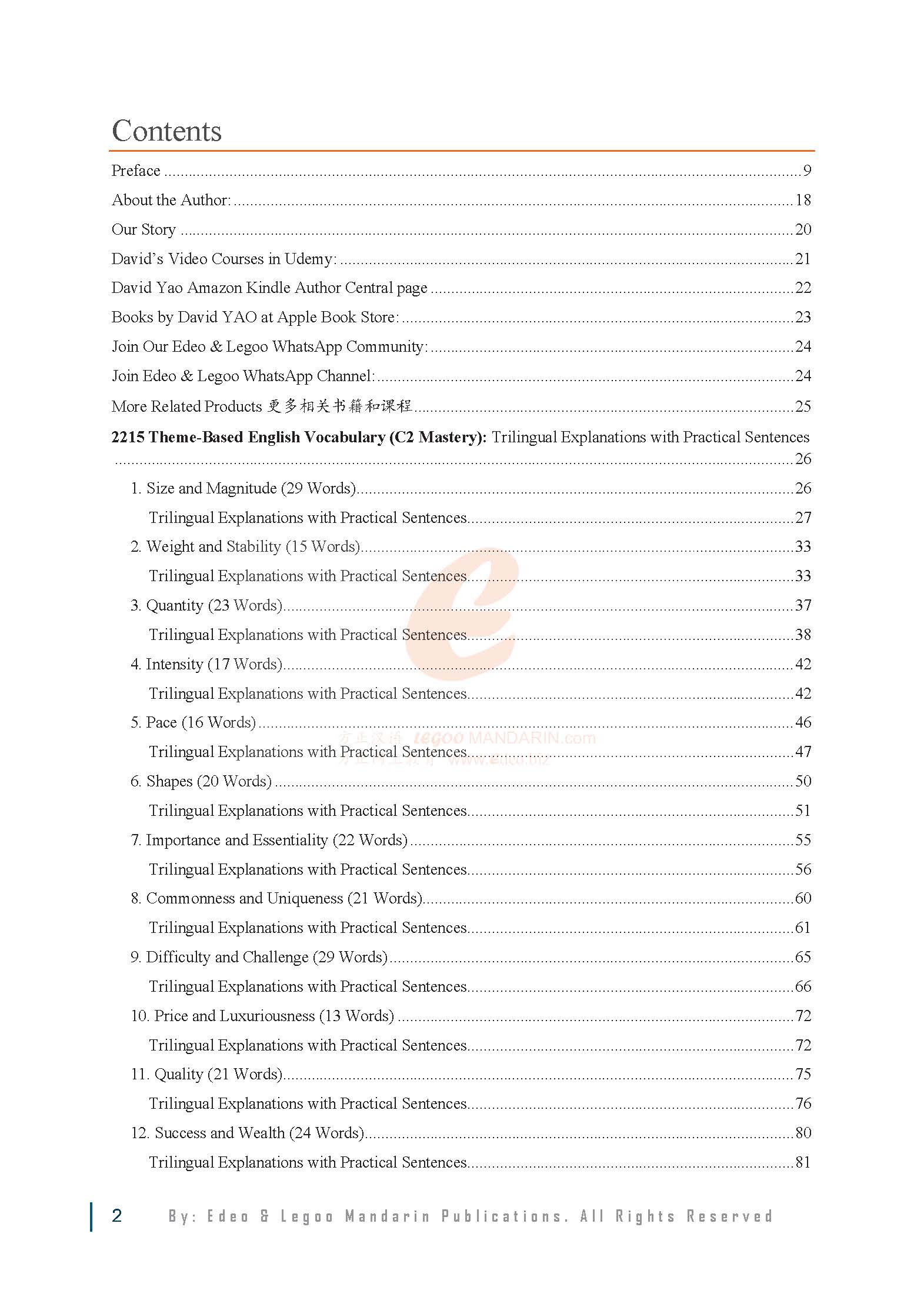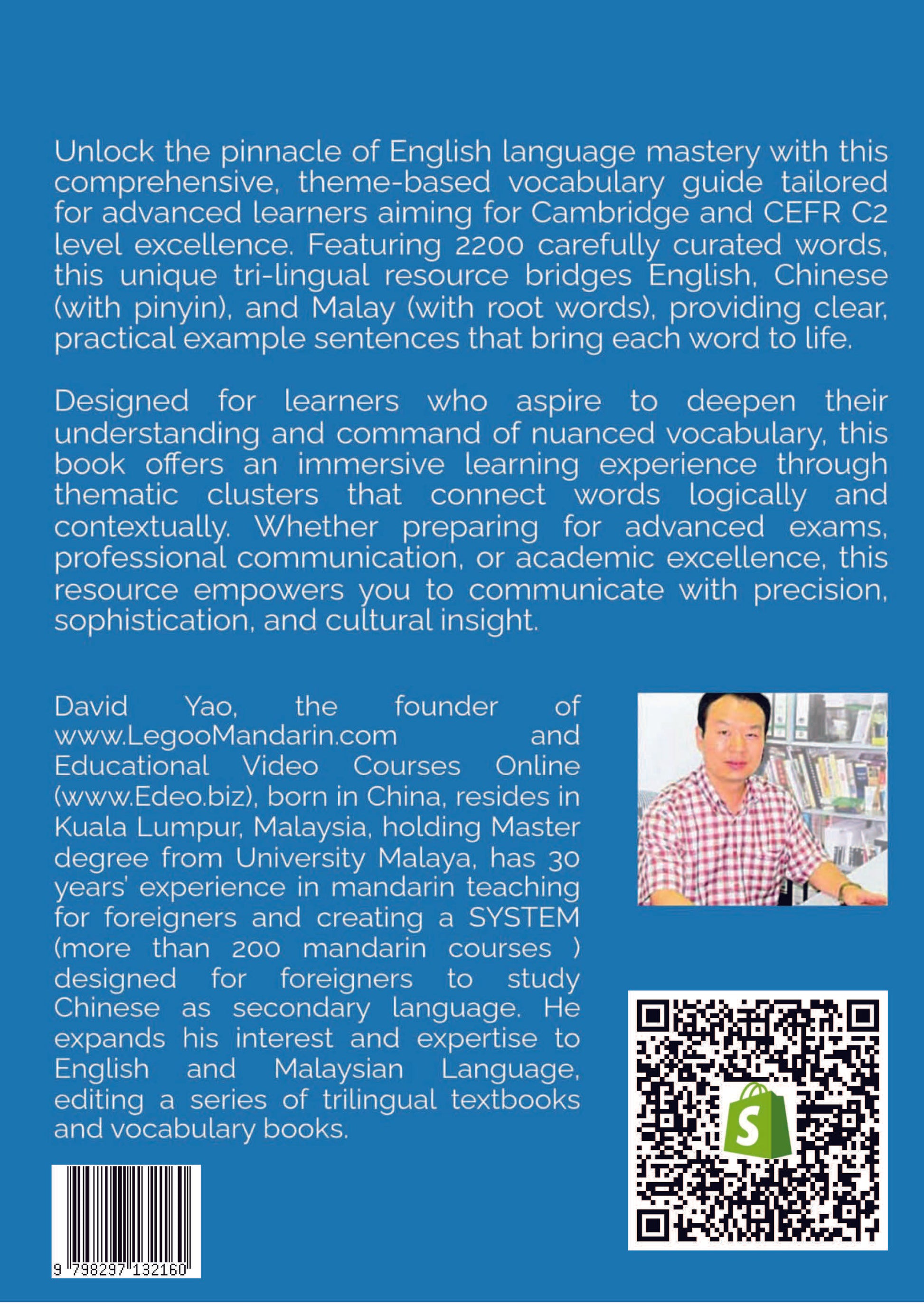 Unlock the pinnacle of English language mastery with this comprehensive, theme-based vocabulary guide tailored for advanced learners aiming for Cambridge and CEFR C2 level excellence. Featuring 2200 carefully curated words, this unique tri-lingual resource bridges English, Chinese (with pinyin), and Malay (with root words), providing clear, practical example sentences that bring each word to life.