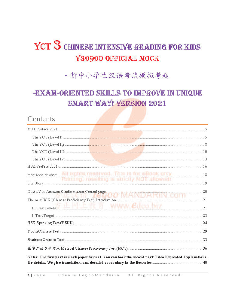 YCT 3 Chinese Intensive Reading for Kids Y30900 Official Mock 新中小学生汉语考试 -Exam-oriented Skills to Improve in Unique Smart Way! Version 2021 少儿汉语考试模拟考题