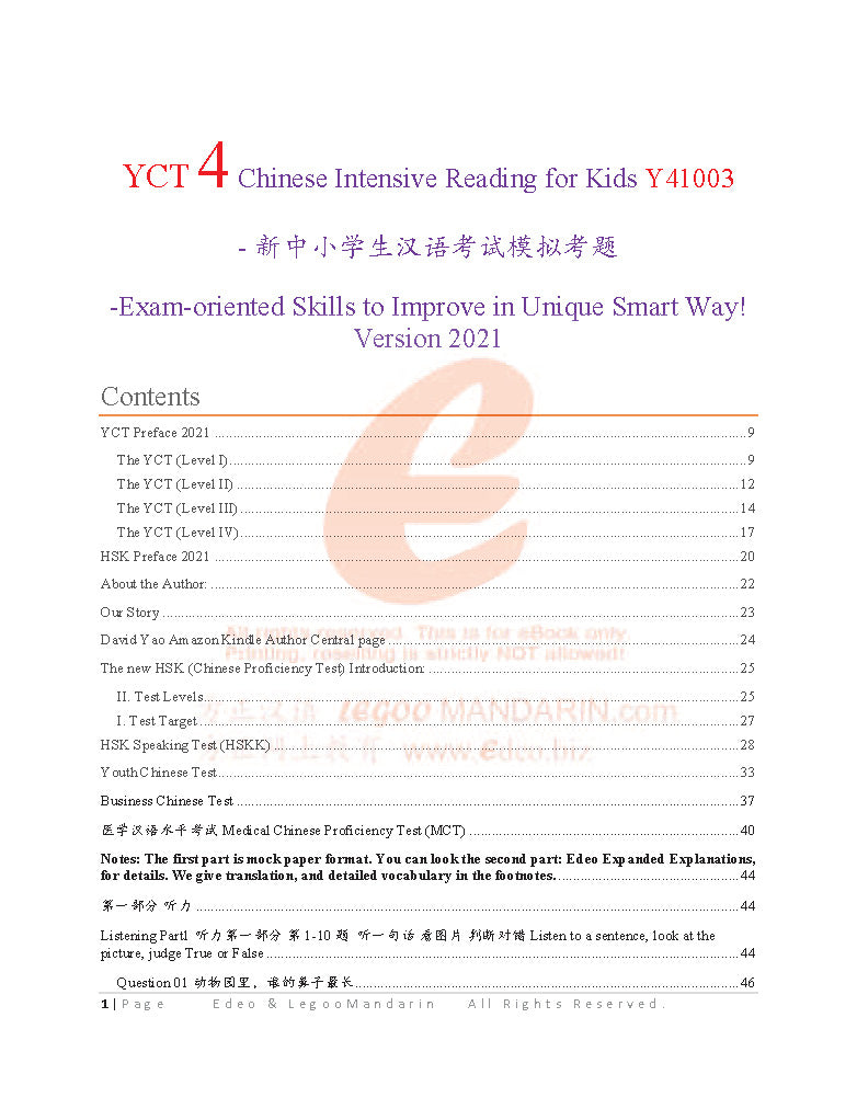 YCT 4 Chinese Intensive Reading for Kids Y41003 新中小学生汉语考试 - Exam-oriented Skills to Improve in Unique Smart Way! Version 2021 少儿汉语考试模拟考题